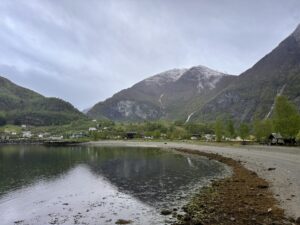 Gelegen aan de Aurlandsfjord, een zijarm van de Sognefjord; het kleine Flåm. De authentieke dorpskern ligt een paar kilometer landinwaarts, daar wonen de meeste van de 500