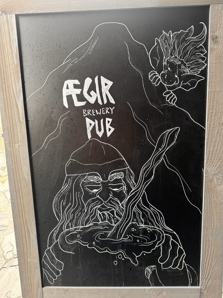 Wil je even bijkomen na de treinrit dan kan dat goed in het straatje met foodtrucks, die uiteindelijk leiden naar de bierbrouwerij. De Ægir BrewPub is gebouwd in de stijl van een Viking-langhuis, met houten drakenkoppen, een imposante open haard van negen meter hoog en een interieur dat doet denken aan een staafkerk. Dit zorgt voor een unieke en sfeervolle ervaring.