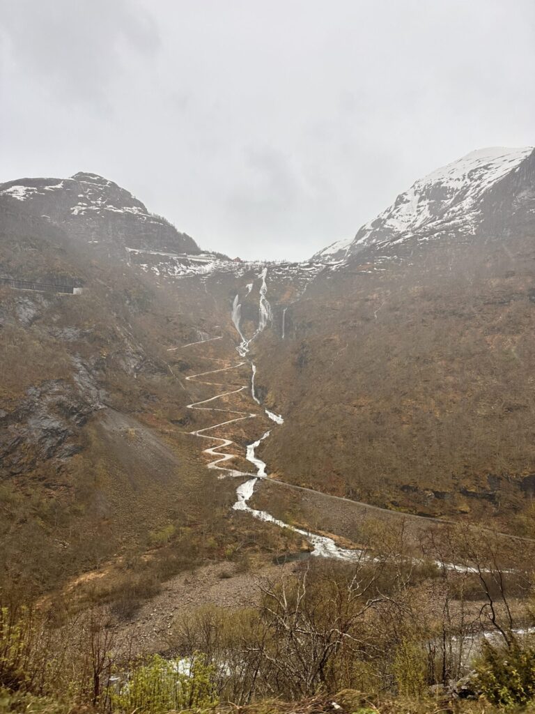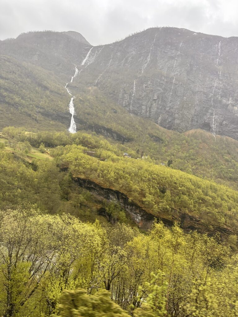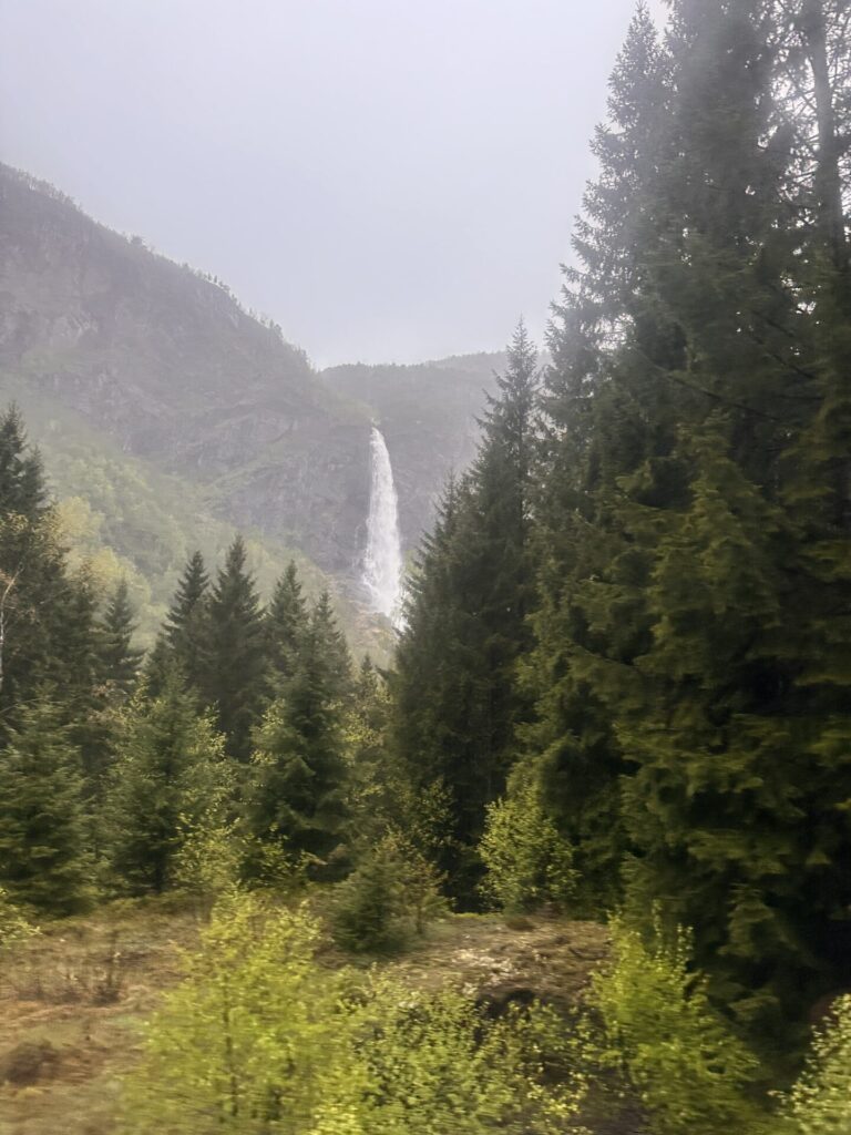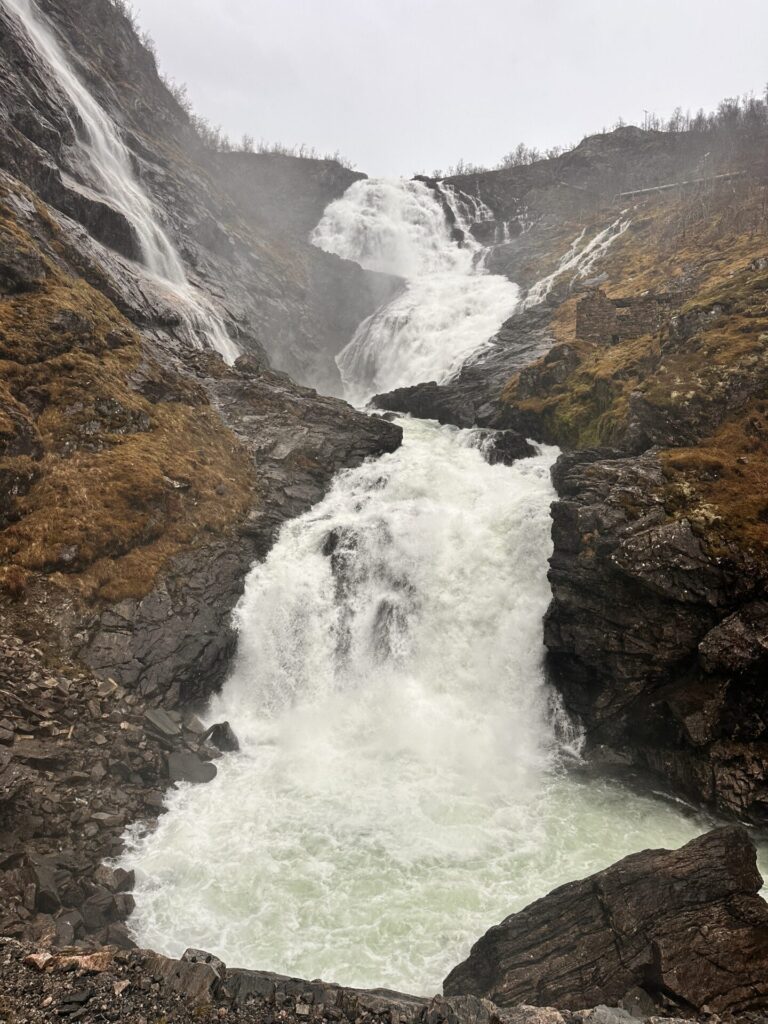 Je rijdt in 55 minuten van Flåm naar Myrdal. Er zijn zes indrukwekkende watervallen langs de route. De Brekkefossen is zichtbaar kort na vertrek uit Flåm en heeft een verval van ruim 100 meter. De Rjoandefossen is ook een spectaculaire waterval met een hoogte van ongeveer 120 meter. De Kjosfossen is de bekendste waterval met een totale hoogte van 225 meter. De trein stopt hier voor een fotomoment.